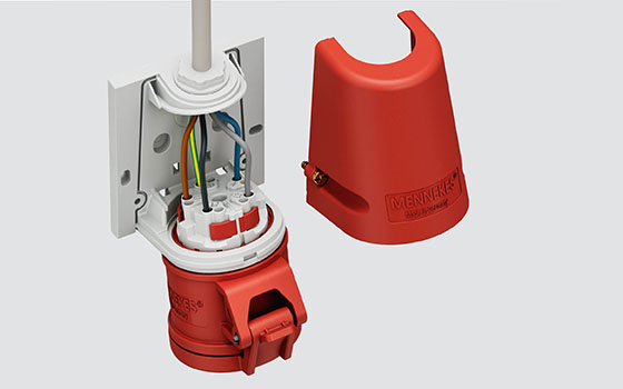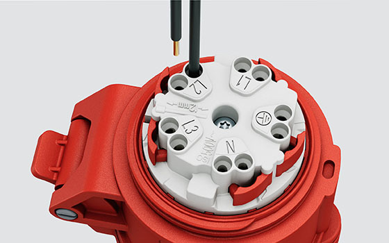MENNEKES vägg- och påbyggnadsuttag i 16 och 32 A finns med den extra tidsbesparande skruvfria fjäderplintskopplingen TwinCONTACT. Här avisolerar du ledaren och för in den helt utan verktyg i uttaget. Kodade dubbelplintar sörjer för korrekt och fast anslutning av ledaren. Om du vill lossa en ledare igen trycker du på den röda frigöringsknappen och kan enkelt dra ut ledaren.